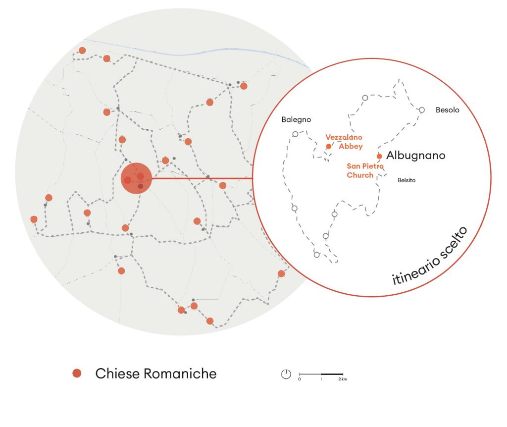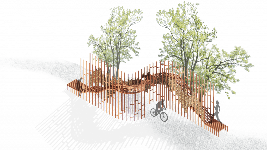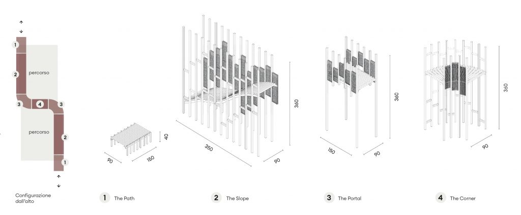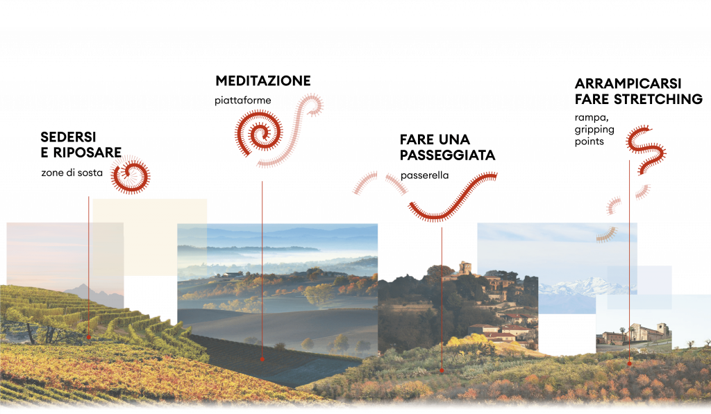 The project “Millepiedi” aims to enhance the territory through temporary structures, located along the Network of the Romanesque. Think of them as stopping points, giving the opportunity to explore the surrounding environment or to do physical activity. Designed as combinations of modules, the installations adapt to the paths in the woods and along the vineyards, creating alternative paths that wind on different heights. The curved shapes and repetition of elements are inspired by hills and rows of vines.