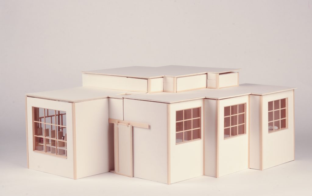 Cross section, starting from the left: the recycling workshop, the kitchen open to the living area and the bathroom.
