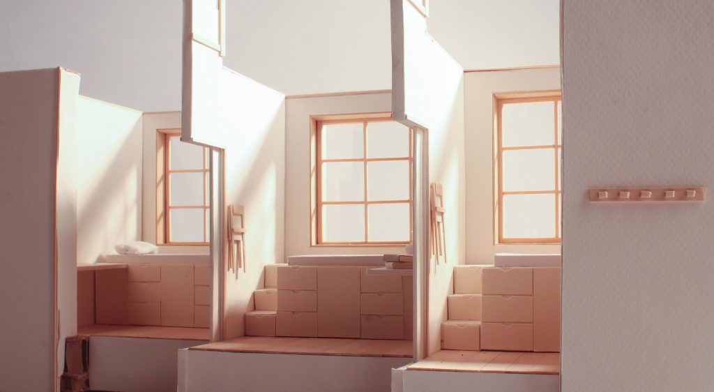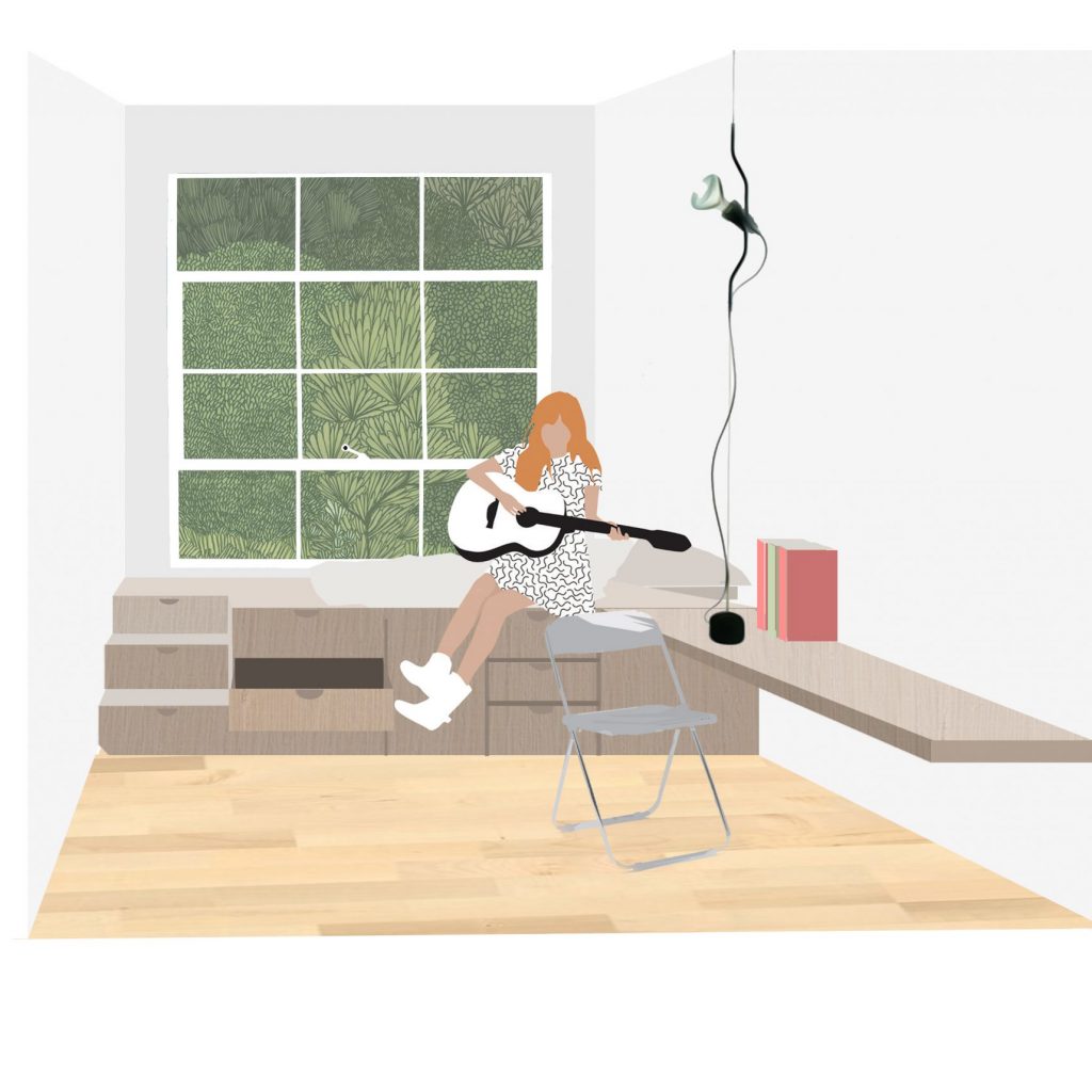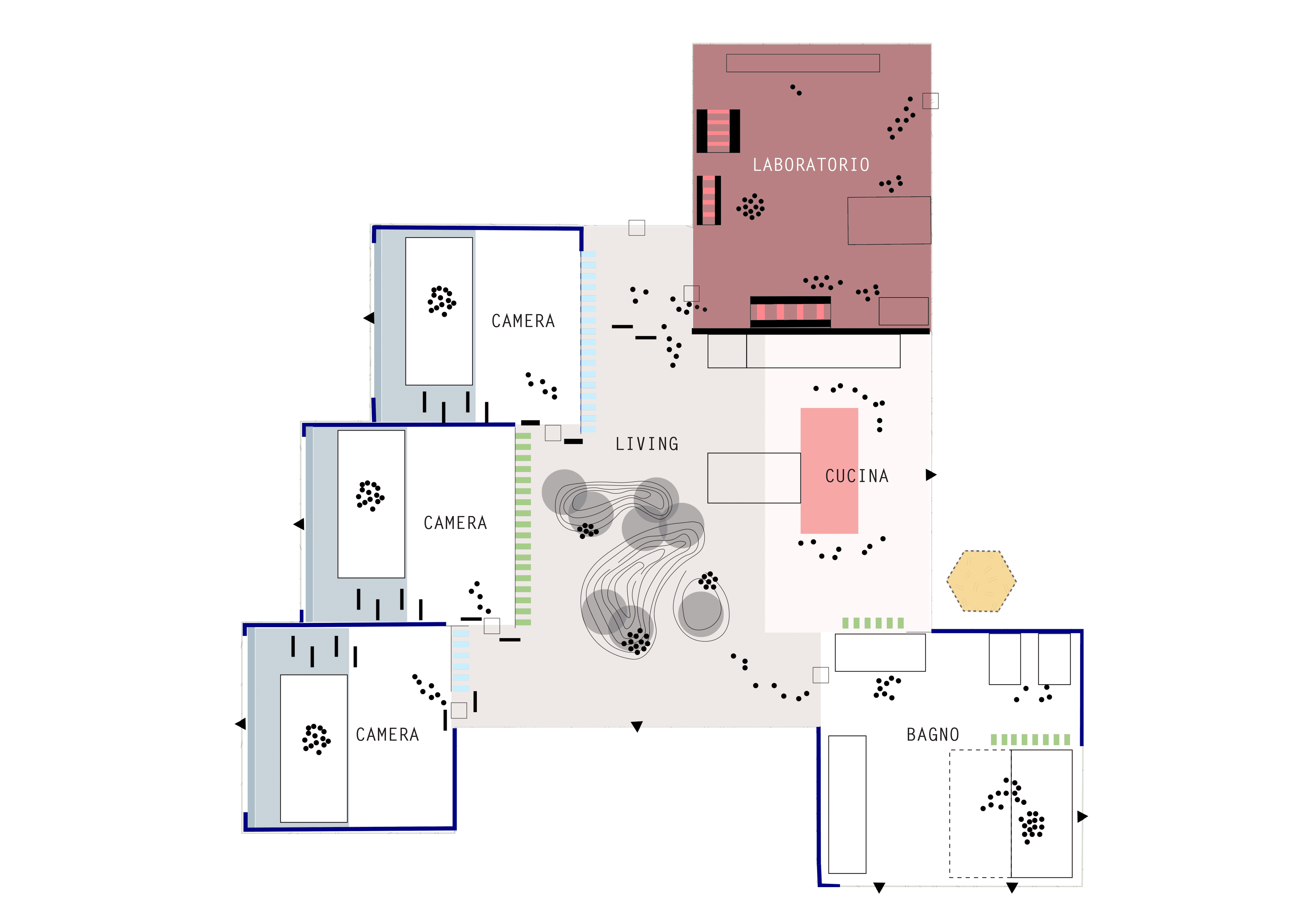The project develops from the needs and hobbies of the three inhabitants who share a passion for recycling materials and ecology. The house of 65 square meters is equipped with outdoor spaces for the collection of plastic and beekeeping. Three private micro-rooms with maximum functionality, revolve around the shared spaces, the fulcrum of the architectural system: the laboratory, the living area and the dining area. The structure is permeated by light and greenery, proposed inside with hydroponic crops.